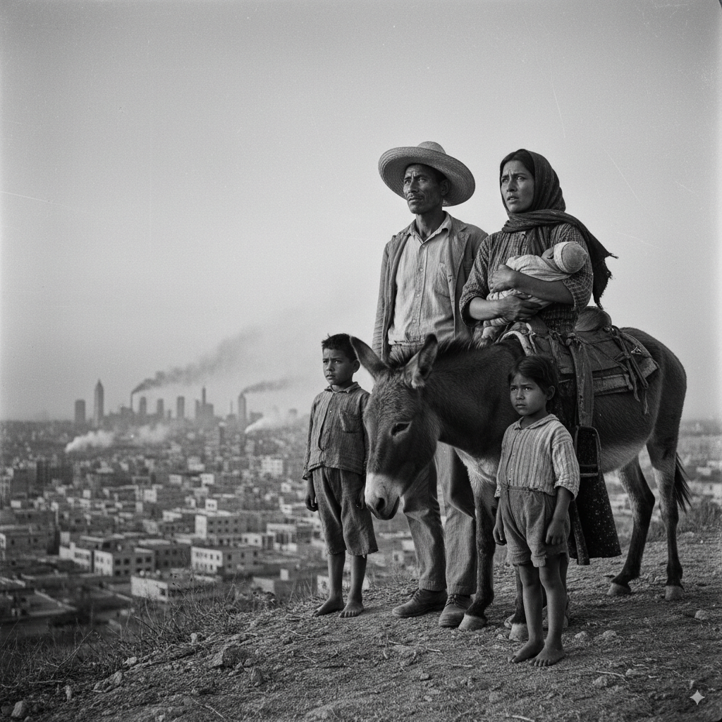 Muchos de los nacidos entonces, fuimos los hijos de esas largas filas de campesinos que migraron del campo a la ciudad, cargando fuertes dosis de temor e incertidumbre en el futuro, pero con la esperanza de ser reclutados como obreros en las enormes fabricas de la era industrial de nuestro país. Llegaron marcados por la pobreza, de la humillación, como los ancestros de siglos atrás en busca de la tierra prometida. Traían un sueño para sus hijos más que con para ellos mismos, queriendo encajar en el suelo duro de las aceras, debajo del cual aún existía la tierra fértil: algo que representara a la vida.